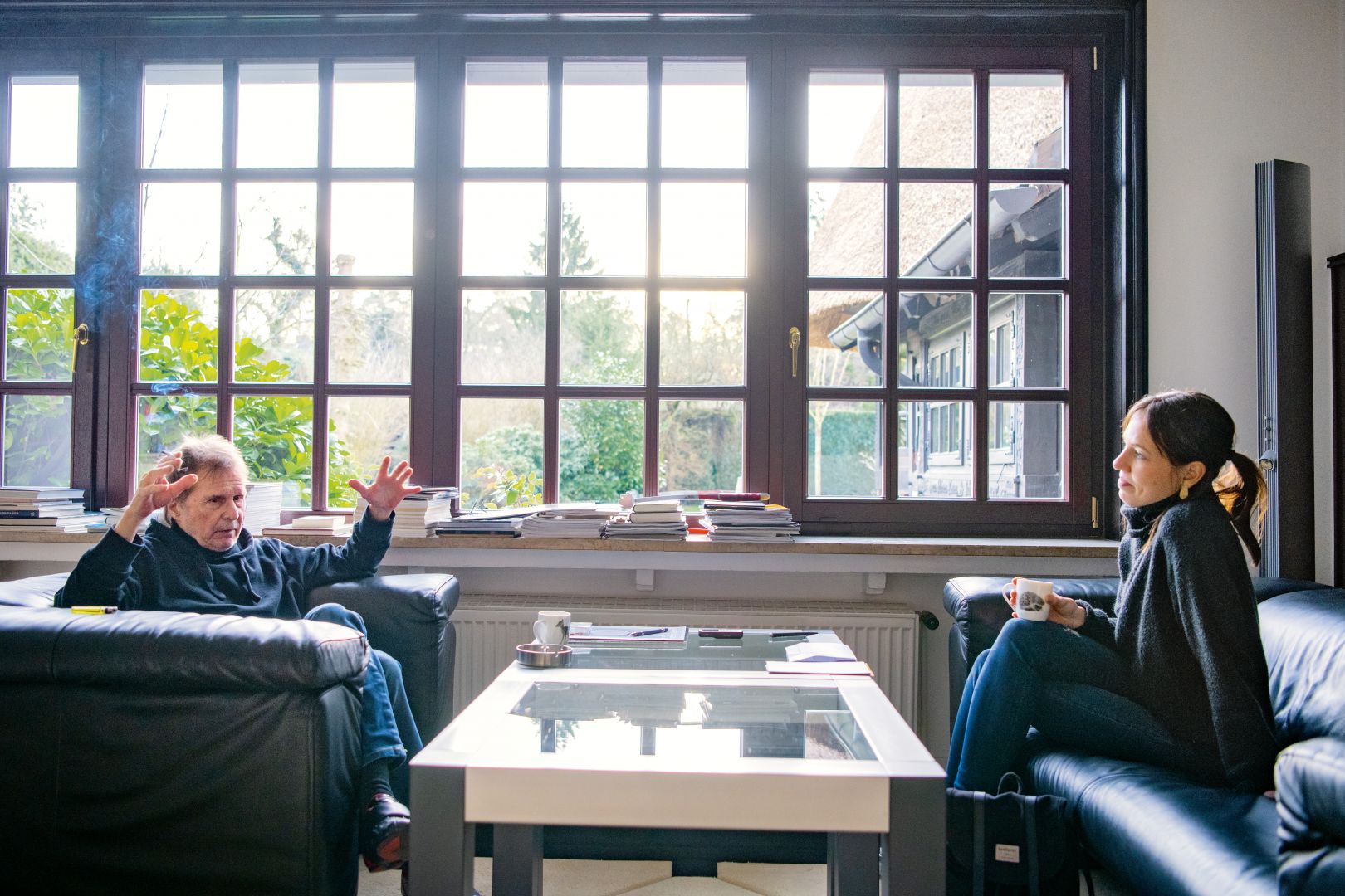 Die ruhige Straße in der Wedemark führt vorbei an großen Kiefern zu einem mit Efeu bewachsenen Haus mit hölzernen Fensterläden und Reetdach. Ein dreieckiges Schild am Straßenrand weist darauf hin, dass hier regelmäßig Eichhörnchen über die Schotterstraße flitzen. Der erfolgreichste Cartoonist Deutschlands öffnet mir die Tür. Er trägt einen schwarzen Hoodie und hellblaue Jeans. Wir duzen uns. Die weißen Wände sind von dunklen Holzbalken und -türen durchzogen. Von Uli Stein fotografierte Hunde blicken mir von großen Wandbildern interessiert entgegen. Wir setzen uns auf zwei Ledersofa, die sich im Wohnzimmer gegenüberstehen. Über gestapelte Magazine blicken wir durch die Fensterfront in den Garten, wo auf einem Tisch Walnüsse für die Eichhörnchen warten und eine Kamera aufgestellt ist, die nachts die Krähe einfangen soll. Uli Stein holt uns Kaffee in Tassen mit Reh- und Igelmotiven. Er lässt eine filterlose Zigarette durch die Hände gleiten, während wir sprechen.