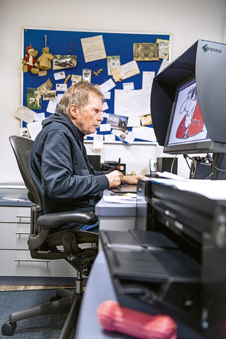 Nee, so schlimm ist es nicht. Genervt hat es mich nie. Auch früher, wenn der Verlag abends angerufen hat und meinte: „Wir brauchen ganz dringend einen Cartoon. Können wir den bis morgen kriegen?" Klar. Damals gab es ja keine E-Mails. Da mussten wir alles auf Papier zeichnen, in einen Umschlag tun, abends zur Hauptpost fahren und es per Eilboten in den Briefkasten einwerfen. Das hat mich aber nie gestört.