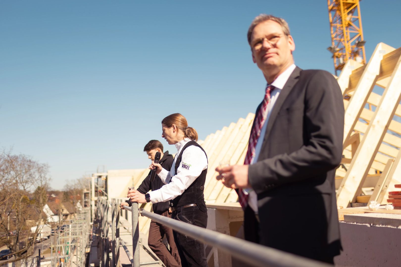 Für die feierliche Rede beim Richtfest stieg spar+bau-Vorstand Rainer Detjen auf das Gerüst des Rohbaus und bedankte sich herzlich bei allen Beteiligten. Detjen lobte den reibungslosen Baufortschritt und den gelungenen Entwurf: „Grundlegende Idee des Gebäudes ist die Laubengangerschließung, sodass dort Kommunikationsflächen entstehen. Denn das ist es ja, was eine Genossenschaft ausmacht: das Gemeinsame, das Miteinander, das Zueinanderfinden.“
